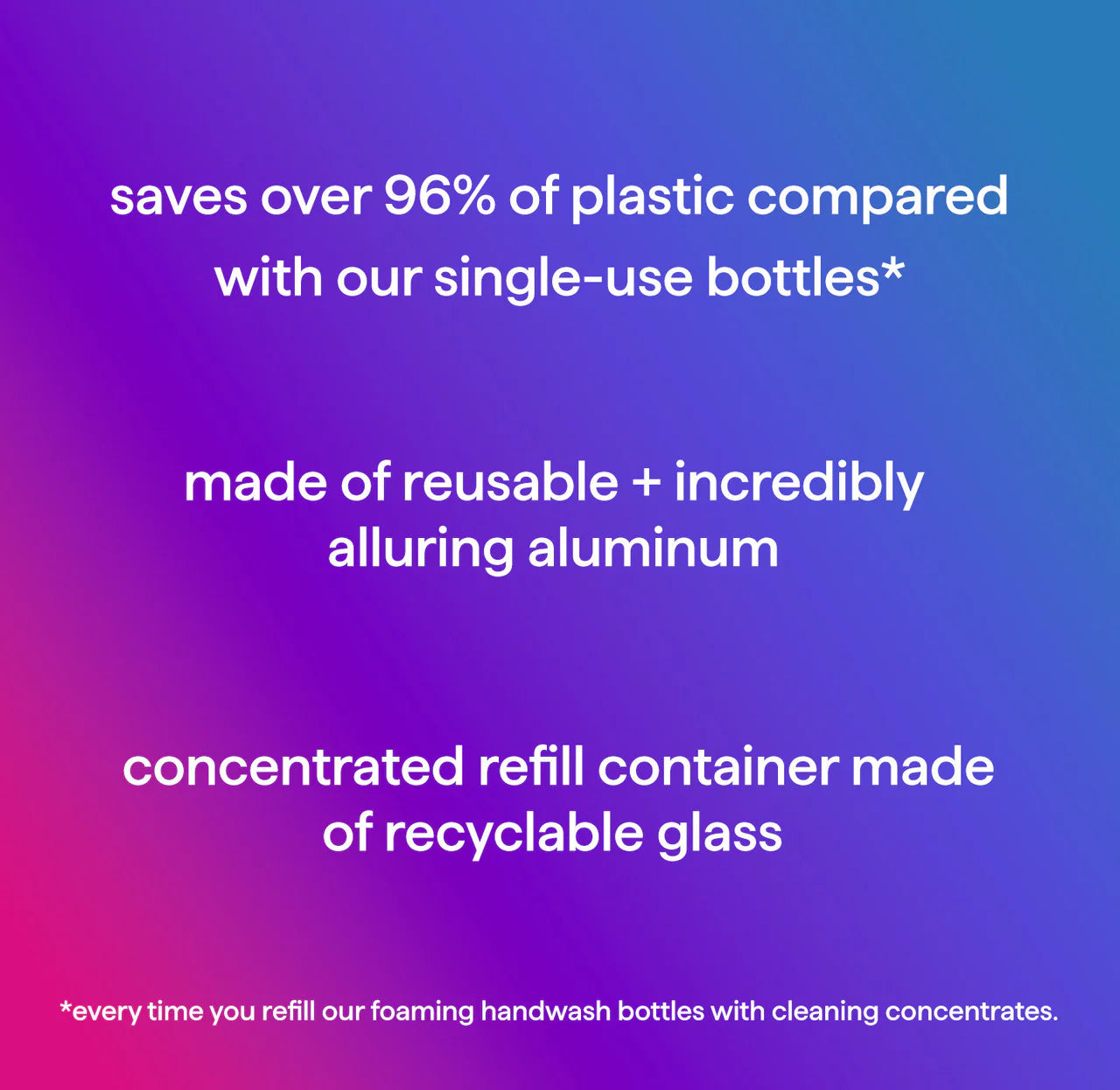 • using method's concentrated refills + aluminum bottle saves over 96% plastic compared to our single-use plastic bottles.