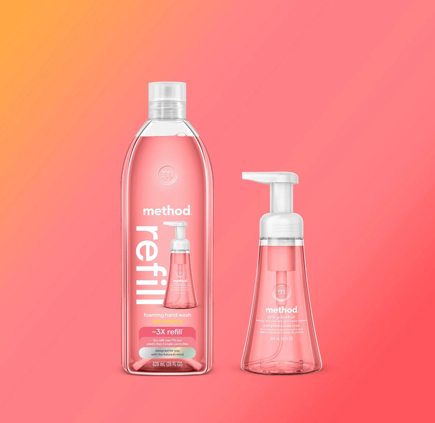 • Refill bottle is made from 100% collected + recycled plastic (minus cap), uses 71% less plastic than 3 single-use bottles, and collection program gives back to communities.