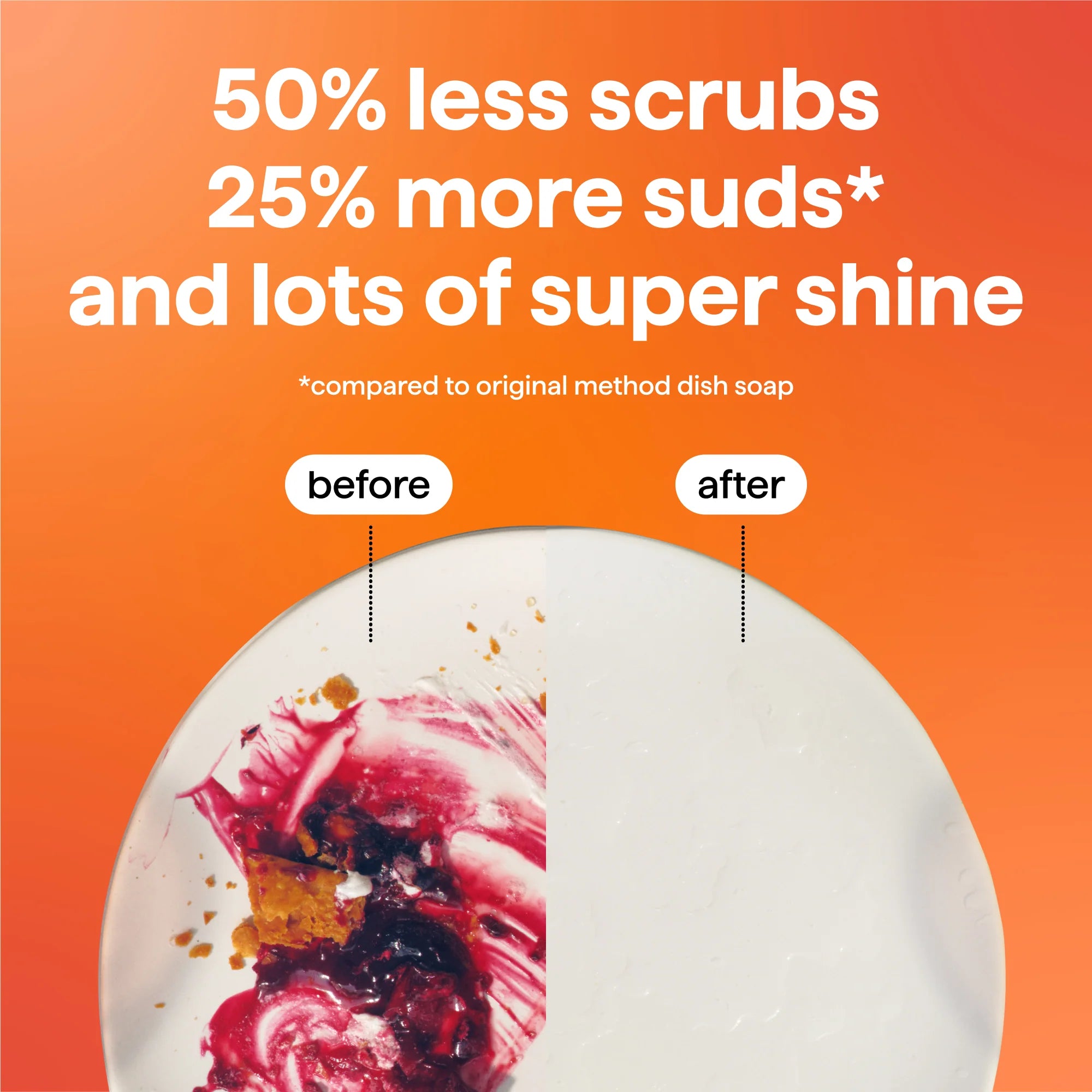 • POWERED BY ENZYMES: Removes up to 99% of grease, with 50% less scrubs and 25% more suds* (*vs. original method dish soap)