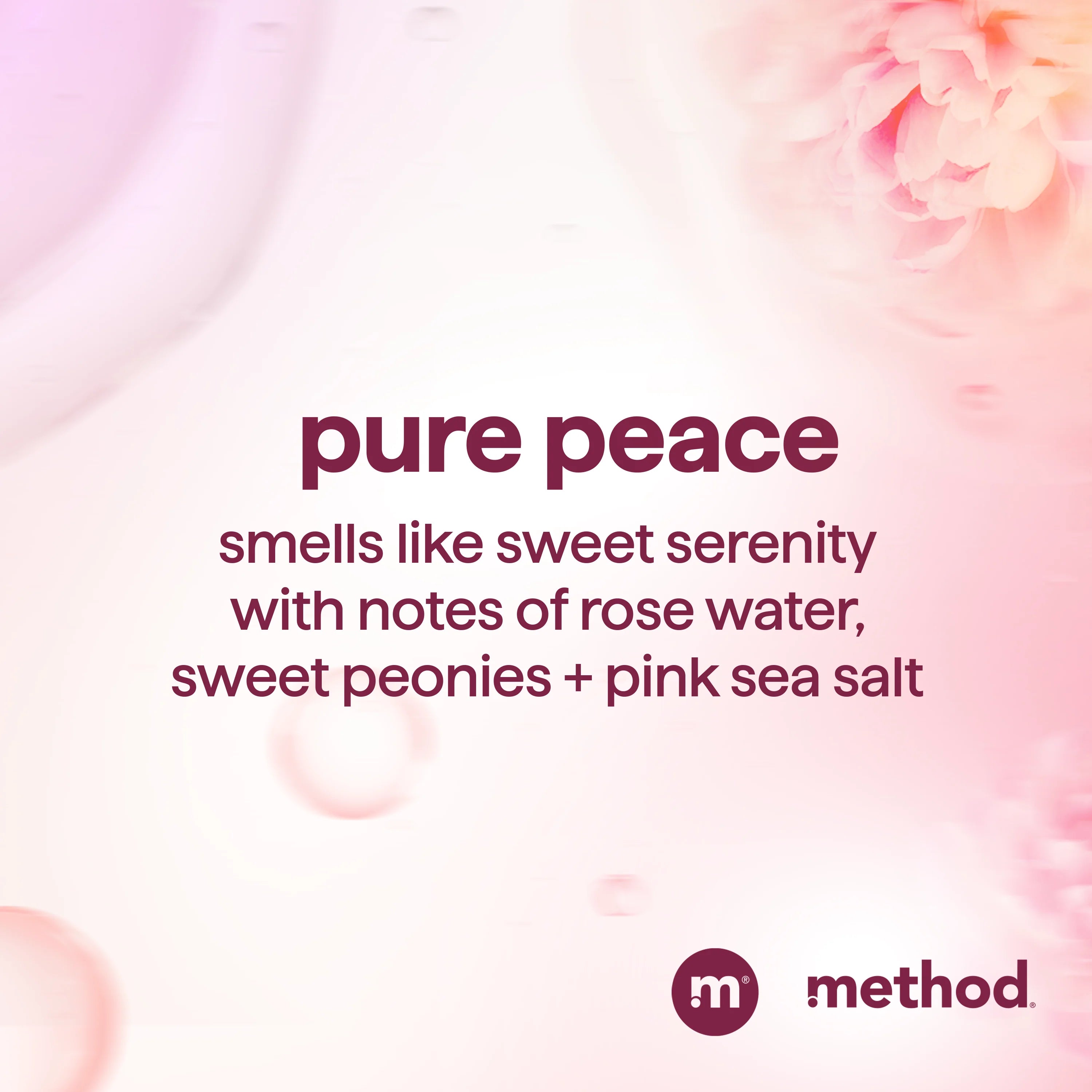 PURE PEACE SCENT: A serene fragrance with notes of rose water, sweet peonies + pink sea salt;...